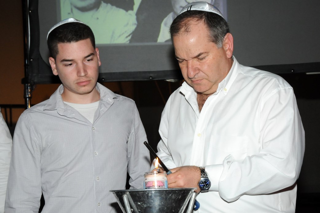 אבי מונצר, דור שני לניצולי שואה, ובנו משאים משואה במהלך הטקס (צילום:נחום סגל)