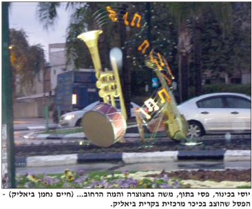 הפסל עשוי בעבודת נפחים בברזל בהשראת שירו של המשורר חיים נחמן ביאליק "מקהלת נוגנים" "יוסי בכינור, פסי בתוף, משה בחצוצרה והמה הרחוב...". הפסל בנוי מכינור, חצוצרה, תוף ותווי נגינה וגובהו 2.5 מ'.