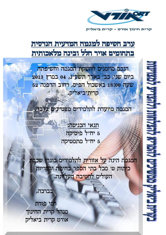 בתאריך 4.3.13 בשעה 18:00 יתקיים ערב חשיפה של המגמה החדשה באשכול הפיס בעיר. המגמה החדשה הוגדרה כמגמה על אזורית , לכן כל התלמידים העולים לחטיבה העליונה מכל בתי הספר בחיפה ובקריות יוכלו ללמוד בה, בתנאי כמובן שהם עומדים בקריטריונים של הרמה הלימודית הגבוהה.