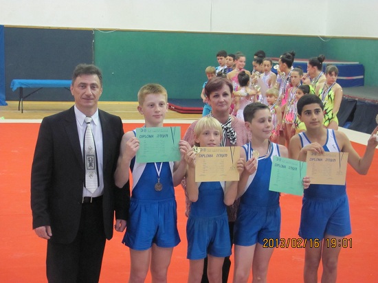 בתמונה: המאמנת טטיאנה ברדיחין, מרק לוי, יותם כח, הנרי בזרודני, יעקב נוביקוב והמאמן בני גורביץ'